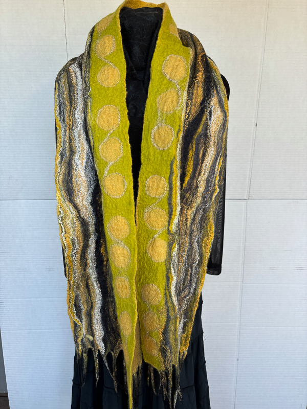 She spends time with a variety of fibers to produce her One of a Kind; Art to Wear scarves, shawls, neck cowls and other appealing apparel.  Suzanne also creates wet felted tapestries that are custom framed.